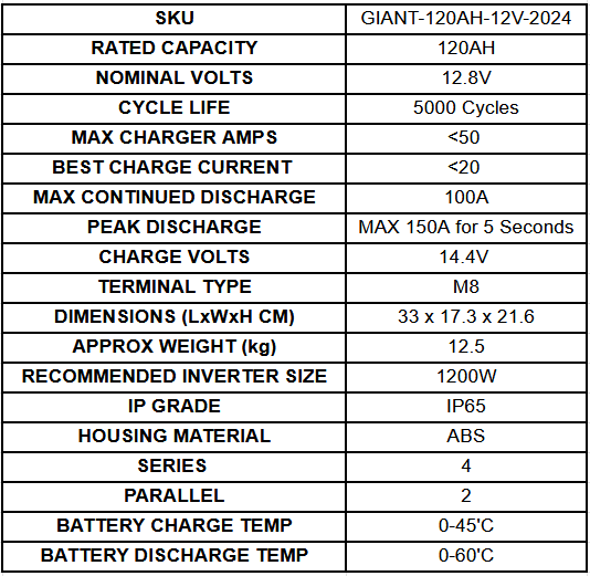 Introducing the Aussie Batteries and Solar Giant Power 120Ah 12V Lithium (LiFePO4) Battery—the ultimate 12V camping and caravan battery for reliable, long-lasting power. Engineered for exceptional performance, this premium LiFePO4 battery is perfect for camping power systems, caravan and RV setups, 4WD touring, renewable energy installations, marine use, and off-grid backup.