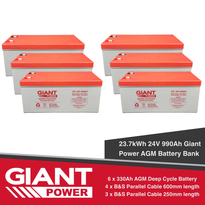 23.7kWh 24V 990AH Giant Power AGM Battery Bank (12V cells)