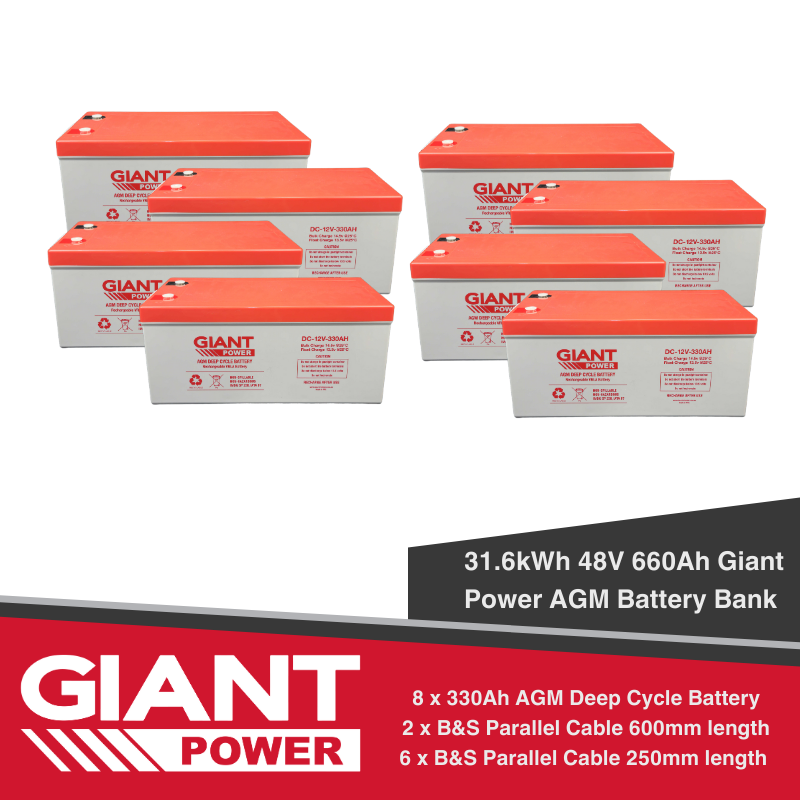 Because of the rugged environments where Giant Power 330AH AGM batteries are used around Australia Aussie Batteries work closely with our customers to ensure our battery products are geared to meet your exact needs. A Giant 330AH can be connected in a series up to 48V or parallel four units to create a huge 560AH! (Best to talk to our 12V experts for advice on the setup if looking to run a battery bank system).
